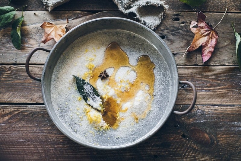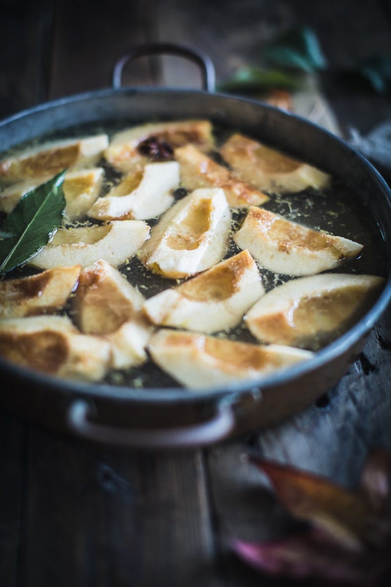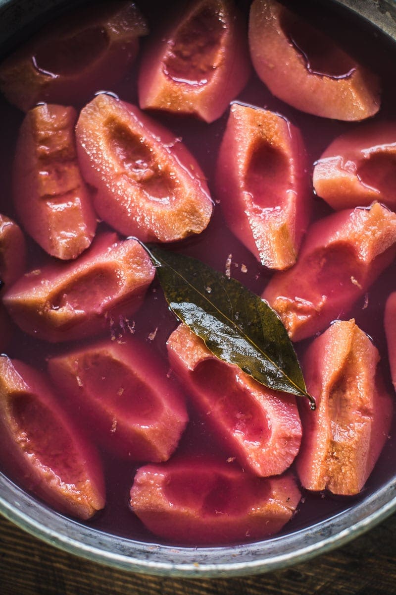 - Add sugar, bay leaf, star anise, vanilla, lemon zest and juice, honey and water to a wide oven-safe cooking pot. Simmer gently on medium-low heat for 5-8 minutes until the sugar has melted. Remove from heat and add all the quince quarters to the pot. Ensure that the quince slices are covered with the poaching liquid. Place a baking paper over the quinces and cover with the pot lid.
