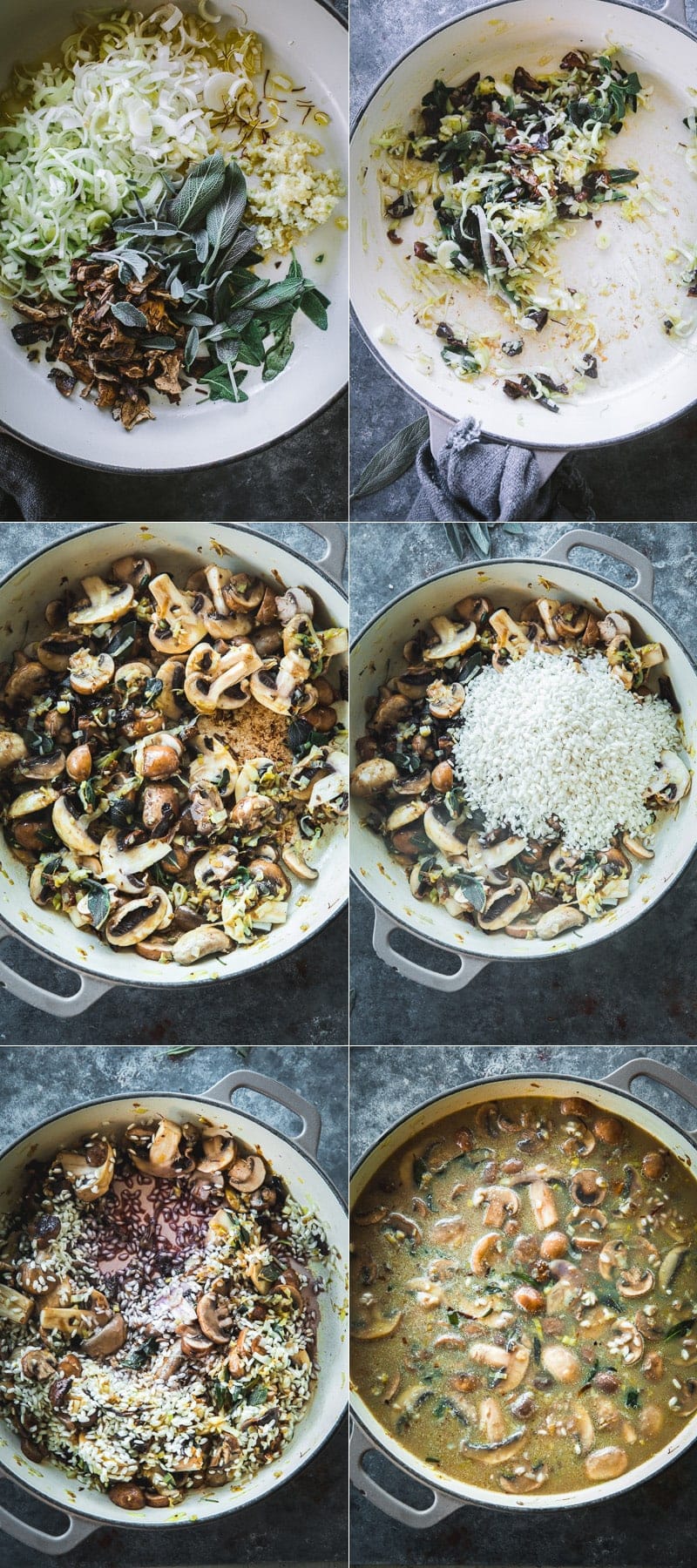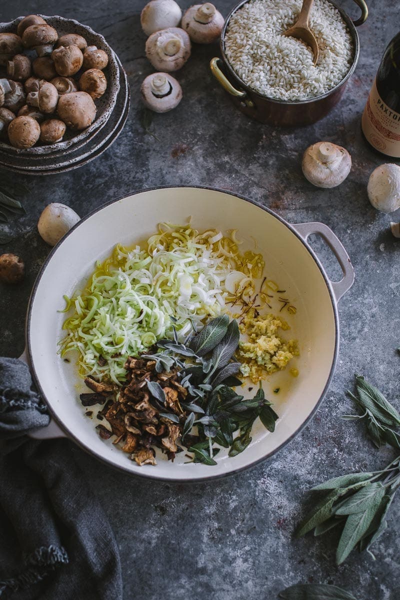 - Heat 3 tablespoons of oil in a large shallow oven-safe sauté pan on medium heat. Add leek. Sauté for a few minutes until the leek starts to soften. Add garlic, porcini mushroom, sage leaves and saffron strands. Sauté, tossing constantly for a few minutes until mushroom and sage start to crisp up.