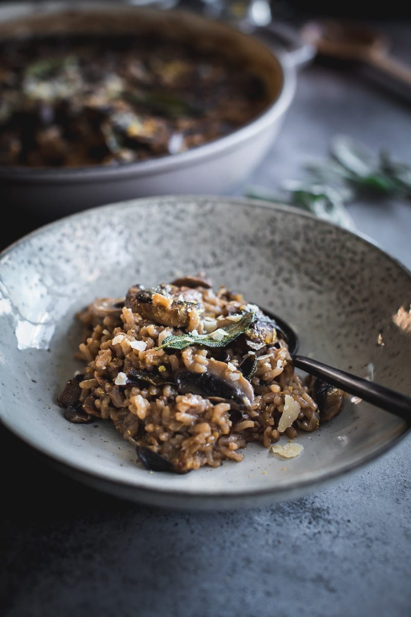 Have you ever tried the combination of caramelized mushroom, garlic and crispy sage? It is unbelievably delicious. The trick is to cook it exactly as I do in the recipe below, sautéing and caramelizing the mushroom and garlic and crisping the sage. All these little steps will take your baked mushroom risotto to flavour town.