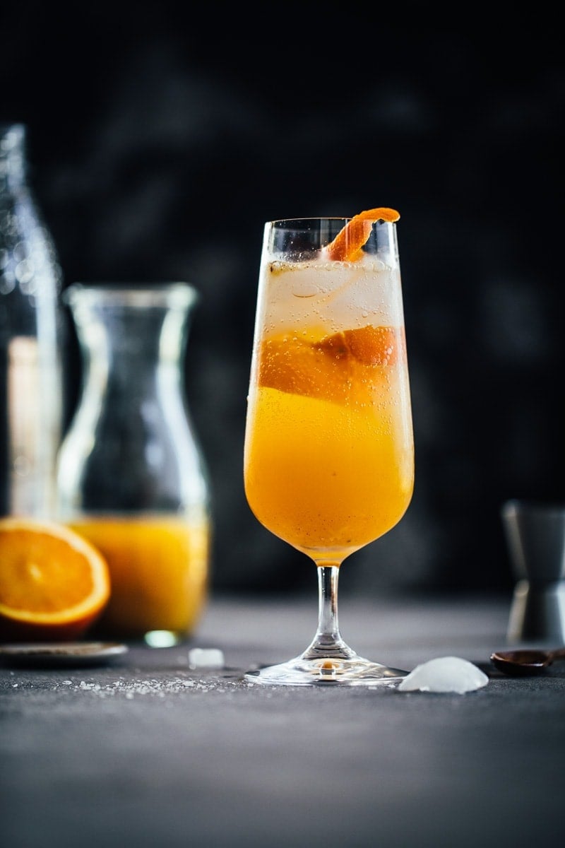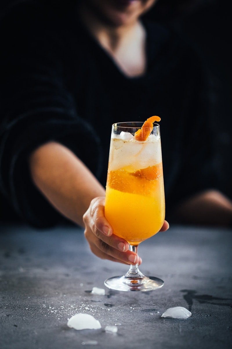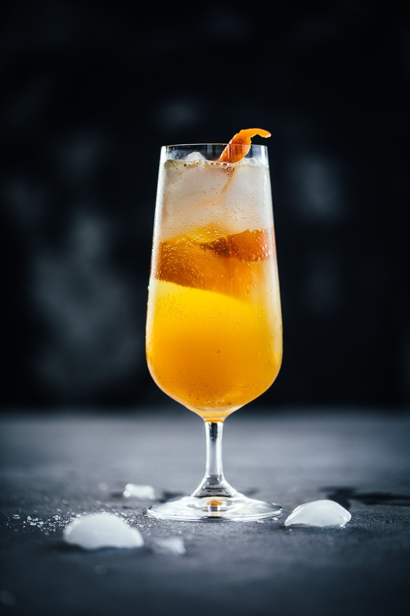 Place ice cubes in a 400ml stemmed cocktail glass. Arrange the orange peel strip along the inside of the glass in a spiral fashion.