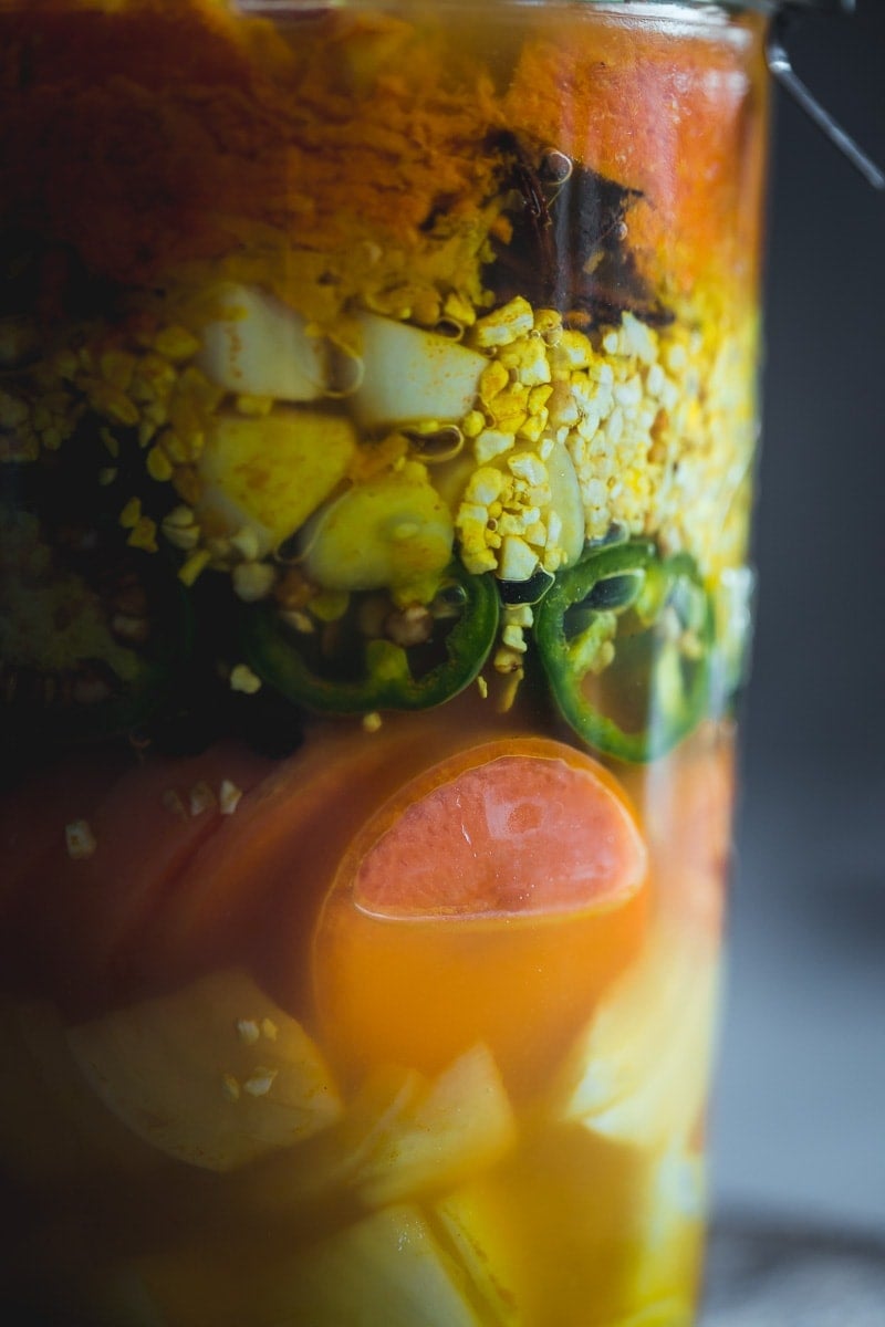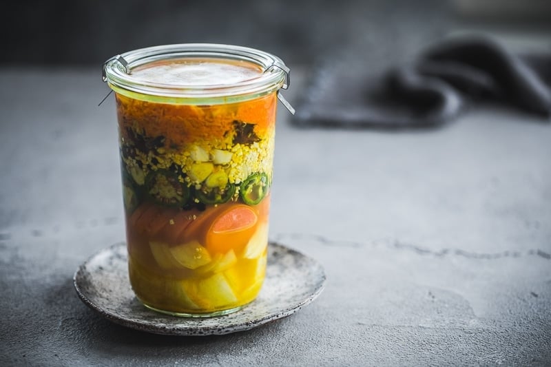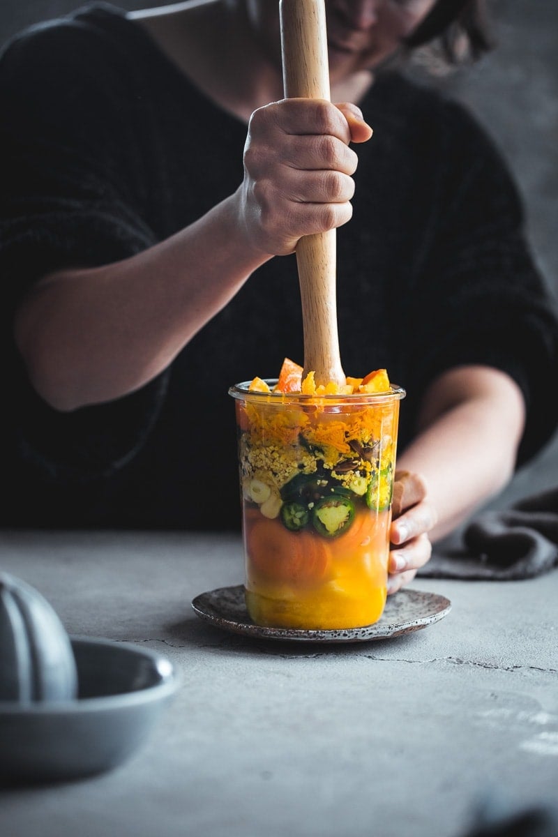 Start layering ingredients starting with onion, carrot, jalapeno and garlic. Add ginger, horseradish and turmeric. Using a cocktail muddler tamp down the ingredients in the jar.