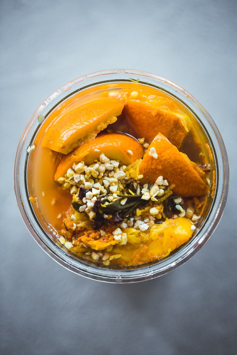 Add orange, rosemary, mustard seeds, peppercorns, salt and star anise. Finally add the lemon zest and juice. Slowly pour the organic apple cider into the jar, till it fills every crevice. Use the cocktail muddler to tamp down and compress the ingredients and top up remaining space with the apple cider.