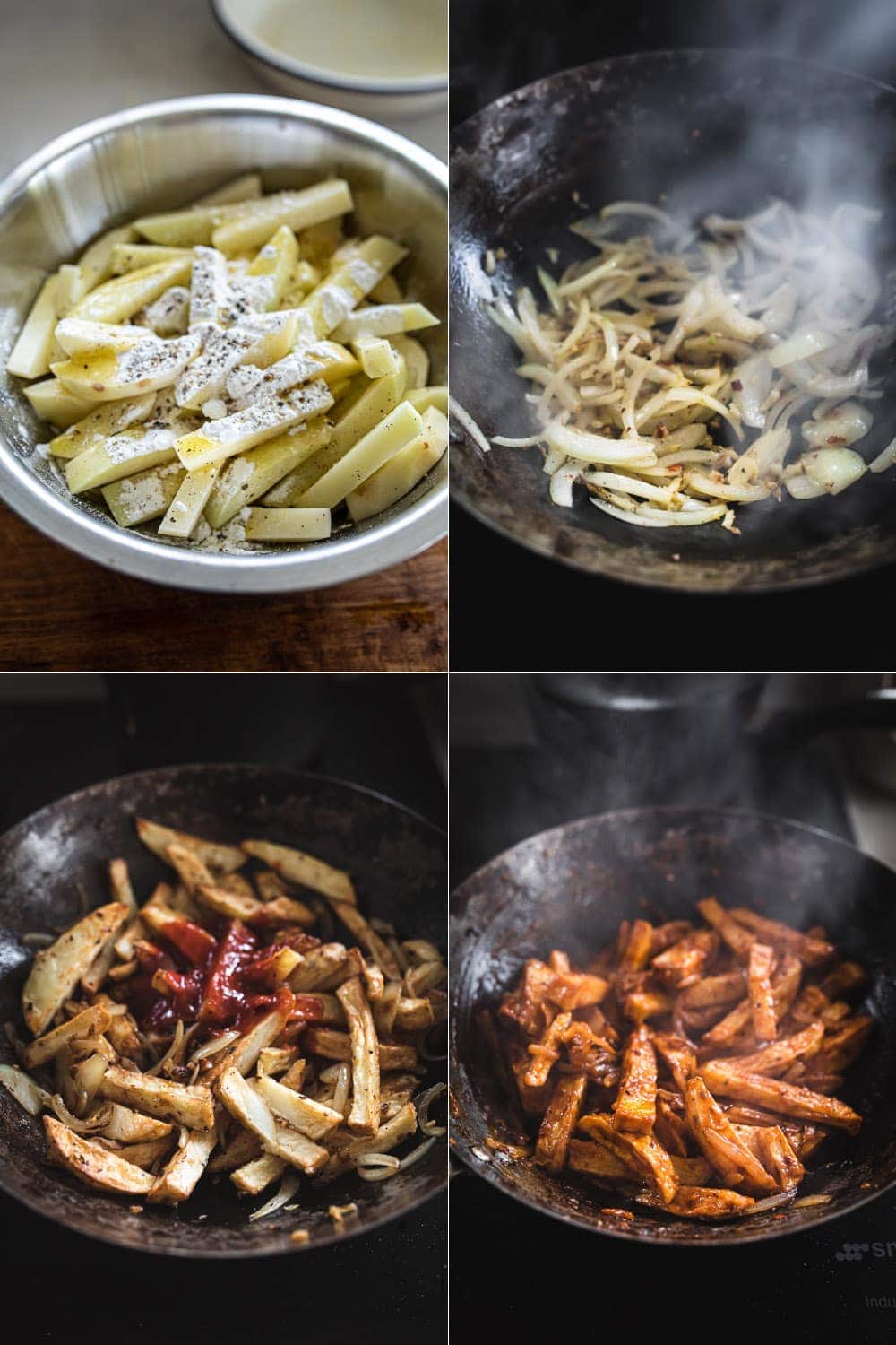 Once the potatoes are roasted, the rest is even easier. As I always maintain while cooking a stir-fry, I follow the Wok Clock (place prepped ingredients in a clockwise fashion in the order in which they go into the wok) and make sure my sauces are mixed in a bowl and ready to go. In today’s recipe, I mix the soy sauce, vinegar, Sriracha and ketchup in a bowl to make things easier.