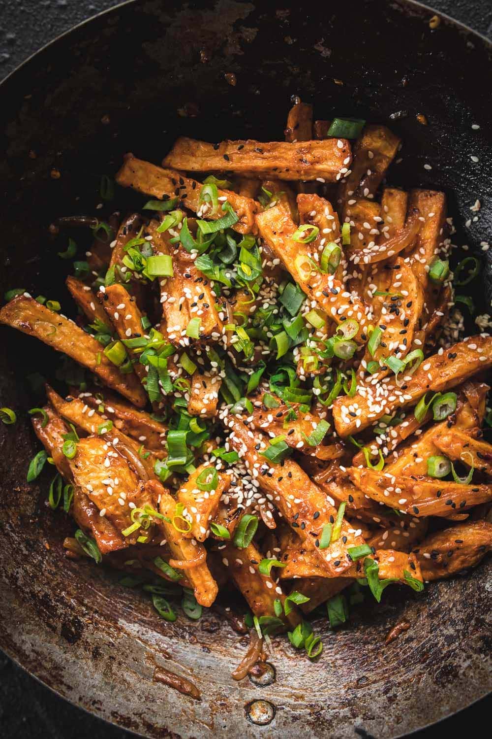 - Remove from heat. Sprinkle with spring onion and sesame seeds. Serve hot.