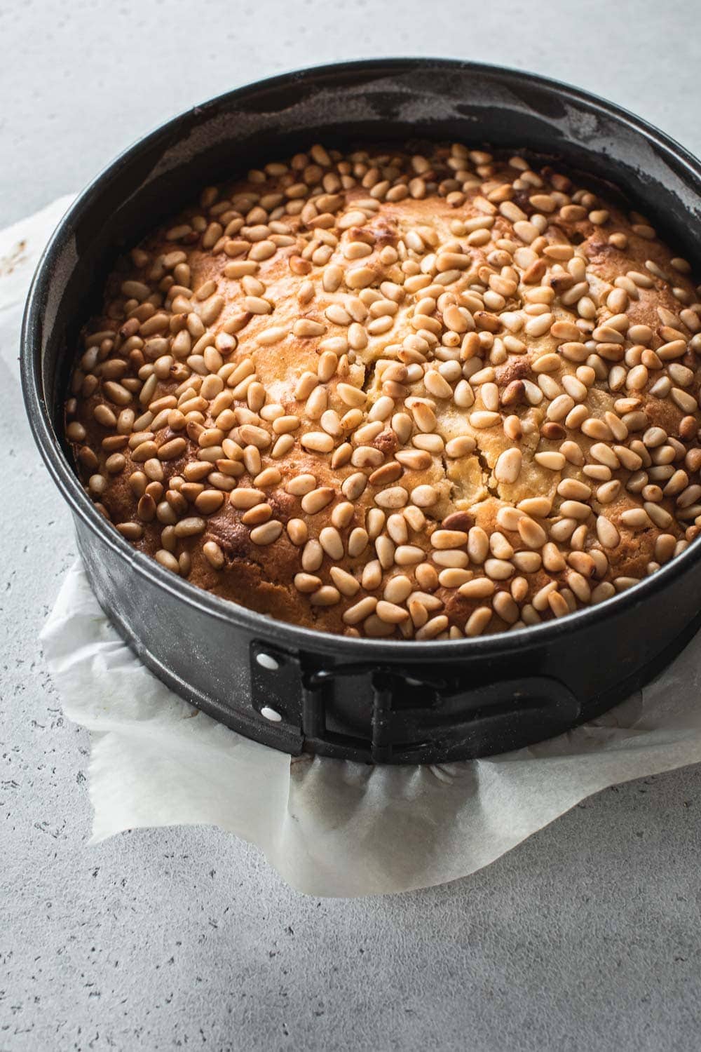 Spoon into the prepared cake tin. Scatter pine nuts on top. Bake in the pre-heated oven for approximately 40-45 minutes until golden, risen and pulling away from the edge of the tin. Turn off the oven. Allow to rest in the oven for 5 minutes.